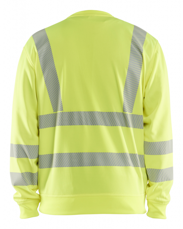 Pehmeä ja mukava highvis college, fleecemateriaalia, katkonaisilla, lämmöllä kiinnitettävillä heijastimilla. Pyöreä pääntie ja resorit hihoissa. Kestää teollisuuspesun.
