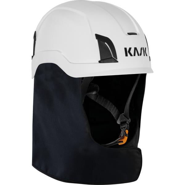 Palosuojattu ja kemikaaleilta sekä valokaarelta suojaava niskasuojusKask Primero, Zenith X ja Zenith X MAX -sarjojen työkypäriien takahelmaan. Helposti kypärässä oleviin kiinnityskoloihin napsauttamalla kiinnitettävä malli, joka suojaa niskaa ja korvalehtiä kuumuudelta, liekkikosketukselta, useilta haitallisilta kemikaaleilta, tuulelta, vesisateelta, lumisateelta, puupurulta, roiskeilta jne. Tarjoaa myös kattavaa suojaa kypärän hihnastolle ja sisäosille hitsauskipinöiltä ja muilta uhkilta.