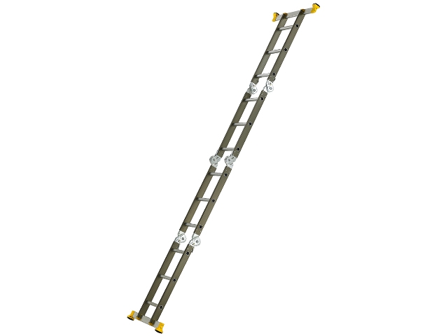 Tikkaiden vastine sveitsiläiselle armeijapuukolle. Vievät vain vähän tilaa kokoon taitettuna, helppo kuljettaa. Voidaan käyttää tavallisina tikkaina, vapaasti seisovina tikkaina ja työskentelyalustana - kolme käyttömahdollisuutta. Leveä jalusta ja kunnollinen liukumissuoja tekevät tikkaista vakaat, ja kiipeäminen on turvallisempaa. Testattu 350 kg:n kuormalla. Lisäksi 8000 kierroksella testatut nivelet tuovat lisäturvallisuutta. Anodisoitu alumiini ei likaa käsiä eikä vaatteita. Mukana tasanne ja jalusta.